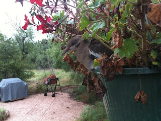 Bandit was looking really smug this morning after catching this mockingbird. I grabbed it off her and put it in the hanging basket where she can't reach. Although she had a damn good try! It is looking dazed but is moving around.